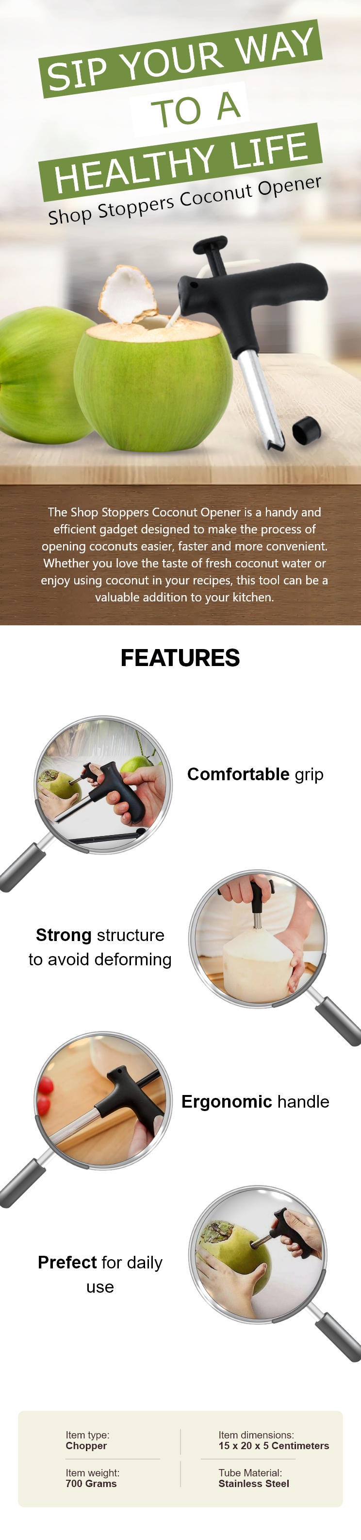 Prefect for daily use when you cut the coconut.Unique design, make it easy to cut the coconut,Extract coconut water effortlessly from young coconuts with this easy toolCleaning stick included,Dishwasher safe.. It's a good helper in the kitchen,Makes a hole perfect for inserting a straw.